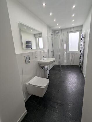 Modernes Tageslicht Bad mit großer Dusche.